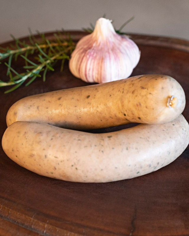 Morcela branca de textura cremosa e sabor delicado, ideal grelhada ou em receitas típicas coloniais.