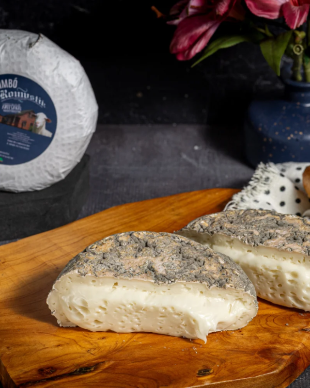 Queijo artesanal de mofo branco cremoso e de sabor suave, ideal para harmonizar com frutas secas e vinhos brancos secos.