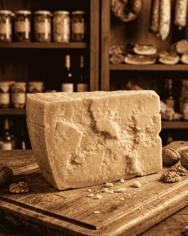 Queijo italiano de longa maturação, com sabor intenso e textura granulada.
