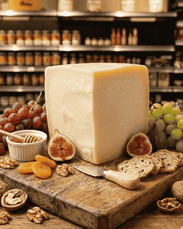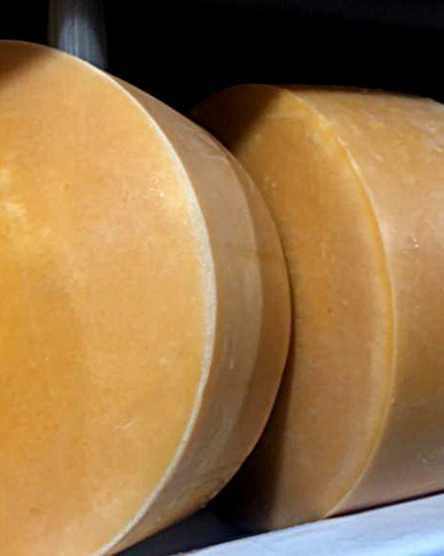Queijo de longa maturação, textura firme e casca natural, com sabor marcante e intenso.