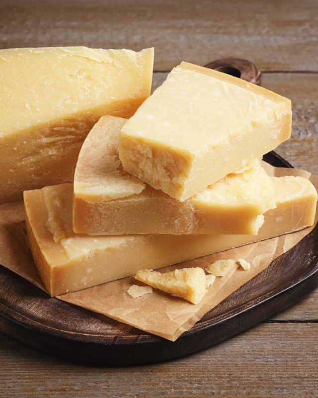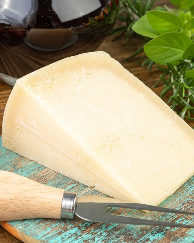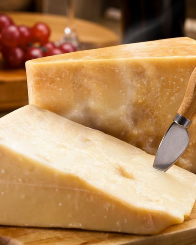 Queijo longa maturação, textura firme e seca e sabor profundo, ideal para ralar em massas e risotos.