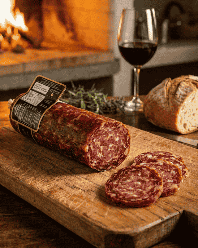 Salame inspirado na tradição italiana, de longa maturação, textura macia e sabor suave, levemente adocicado.